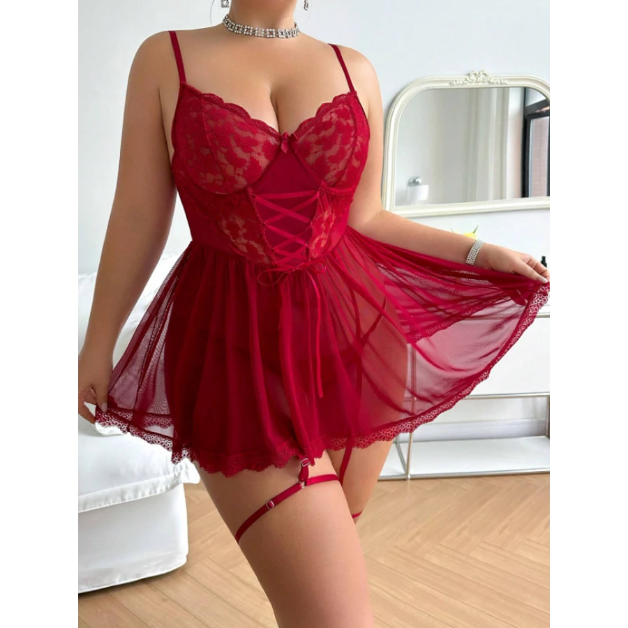 Ez a klasszikusan szexi, burgundi árnyalatú négy részes fehérnemű szett tökéletes választás azoknak, akik magabiztosan és nőiesen szeretnék érezni magukat. A kontrasztos csipke, a criss cross pántok és a hálós szövet érzékien simulnak a testre, miközben kényelmes viseletet biztosítanak. A finom részletek és az állítható pántok minden alakon előnyösen mutatnak – ez a szett igazi plus size kedvenc.