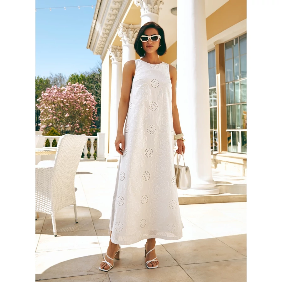 Szellős, kényelmes szabású hosszú ruha pamut brodéri anyagból, béléssel ellátva. A szabás szabad mozgást biztosít, így kényelmes viselet. A geometrikus perforációk egyedi textúrát adnak a ruhának. Cipzár vagy gomb nélküli, egyszerű felvétel.