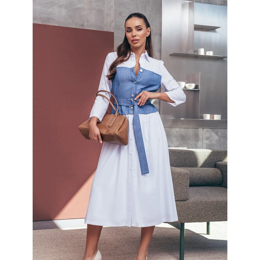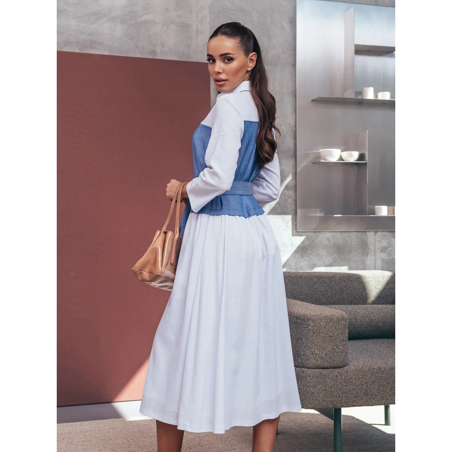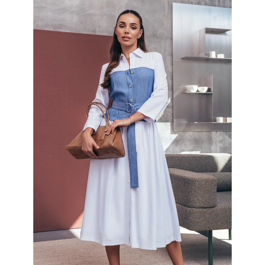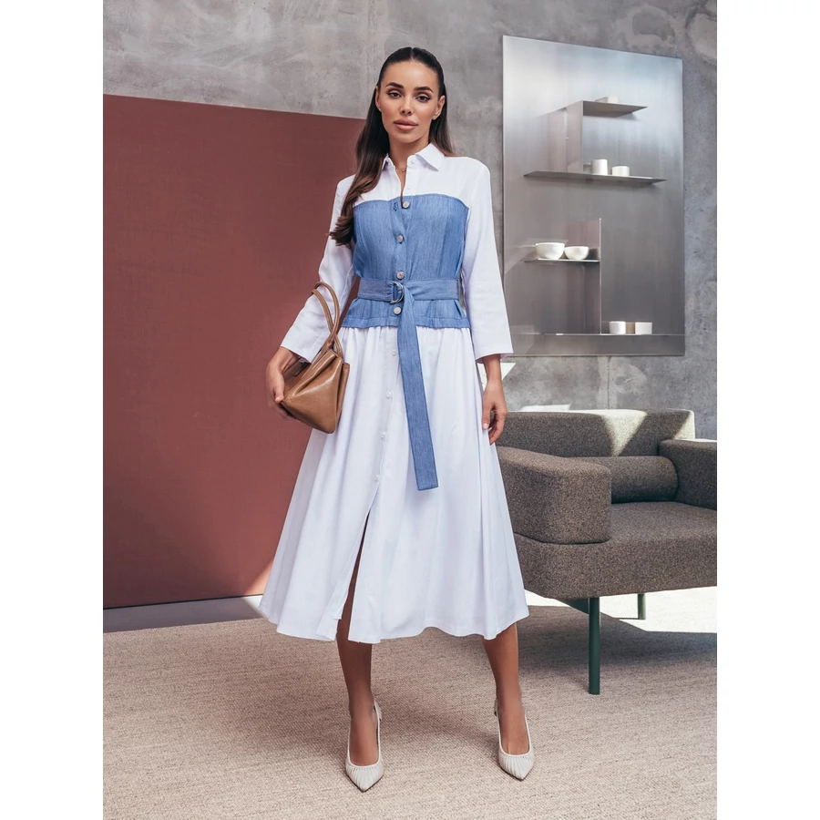 Ingruha fűzőhatással. A design két különálló darab illúzióját kelti, ötvözve az egyrészes ruha kényelmét és a fűzős felsőrész eleganciáját. A felső rész puha, farmer színű tenselből készült. Övvel, csattal kiegészítve. Az alsó rész és az ujjak fehér lenvászonból készültek. Belül kényelmes, poplin bélés található. A ruha gombbal záródik.