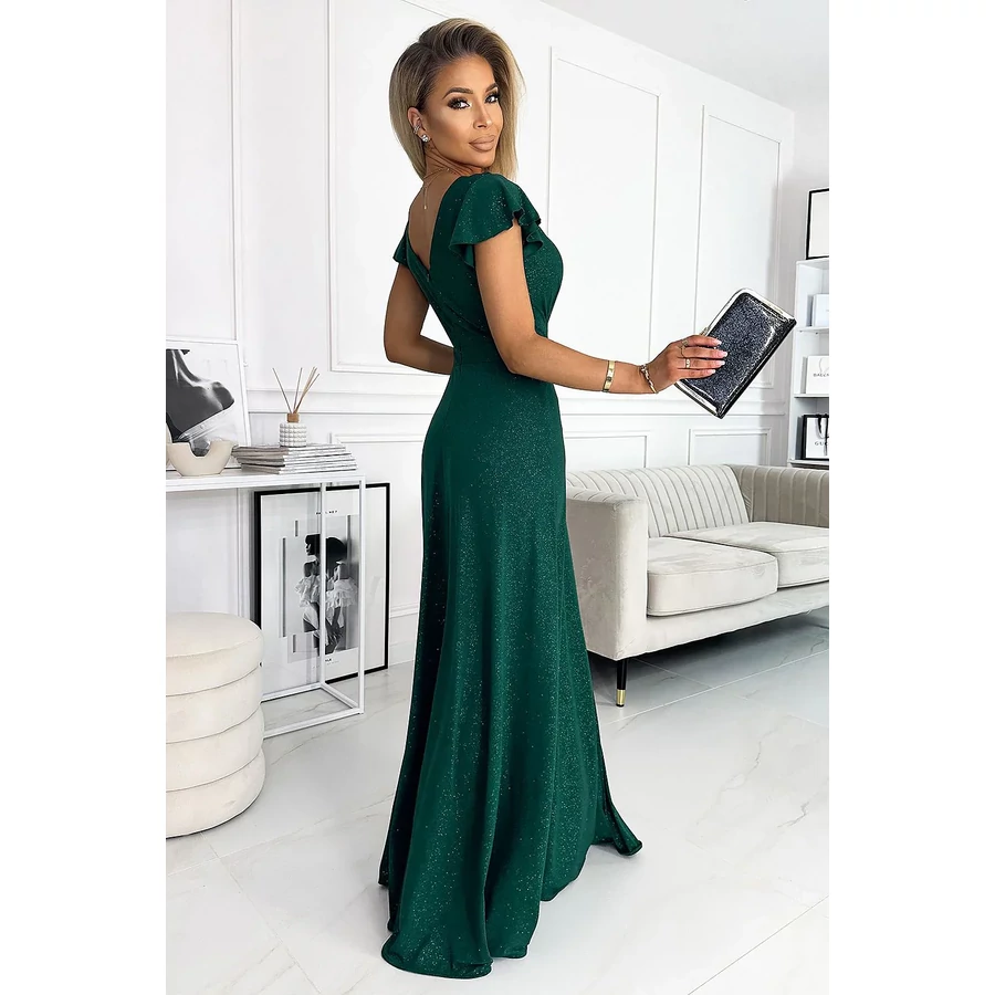 Hosszú, csillogó maxiruha borítékolt nyakkivágással és lábszárkivágással. Ruha piros színben, csillámokkal. A ruha gyönyörűen kiteszi a dekoltázst, és nagyszerű táncolni. Hátul fedett cipzárral záródik. Lengyel termék. Márka numoco.